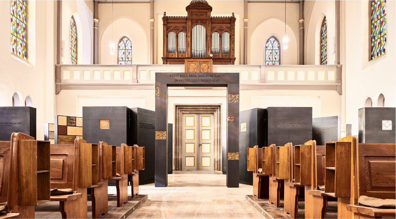 Ein würdevoller Ort der Ruhe. Das Kolumbarium besteht aus Buchskulpturen mit 576 Urnenplätzen, die Einzelnischen oder Doppelnischen sind. Jeder „Buchtitel“ wird durch einen Psalm bestimmt. Als Angehörige oder Angehöriger können Sie also schauen, welcher Psalm am besten passt. Außerdem ist jede Verschlussplatte aus Holz von Hand bemalt und damit so einzigartig, wie der oder die Verstorbene selbst. Sie können hier eine passende Nische für die Beisetzung Ihrer Lieben auswählen – oder eine Ruhestätte für sich selbst reservieren.